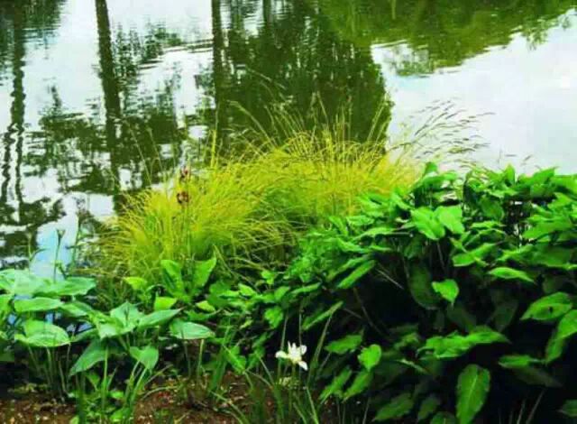 水中植物须选择色彩及大小、体量相宜的种类,常利用中高型的观赏草来分割水面空间,增加层次,同时也可以创造活泼和宁静的景观,也可沿池塘边缘种植观赏草以形成人工界线。在池岸边种植时,还可将池岸边缘隆起,使植物的根部获得充足的水分,为多种观赏草提供理想的生长条件,局部再现水生植物的群落景观。