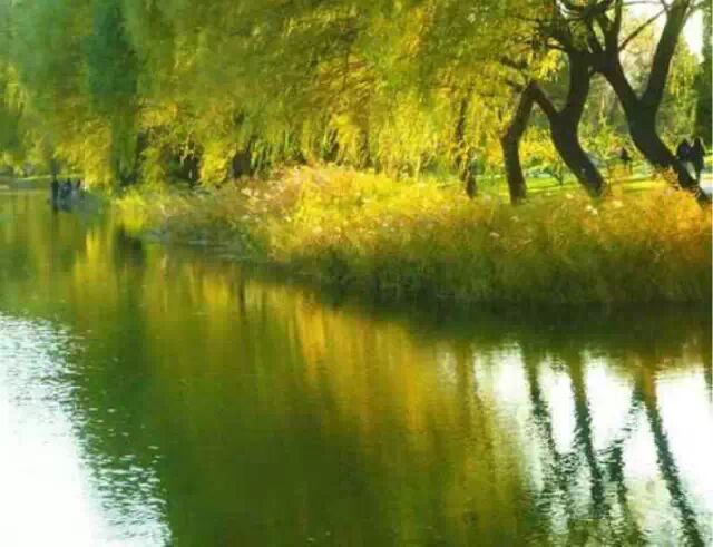 如北京植物园湖面辽阔,视野宽广,沿湖成片栽植香蒲,春季色彩翠绿可人,秋季金黄,植株随风摇曳,充满动感。也可以采用两种或两种以上的观赏草种类作有规律的交替变换,体现韵律,形成连续的动态构图。如颐和园昆明湖一处水域(图1.2-1),开阔自然,水旁间隔种植水葱、香蒲、芦,高低错落有致,色彩变化鲜明,与水中倒影交相呼应,以其独有的色彩、姿态,为水面增添了一份生态意韵。但切忌等距离同体量的观赏草沿湖栽植一周。
