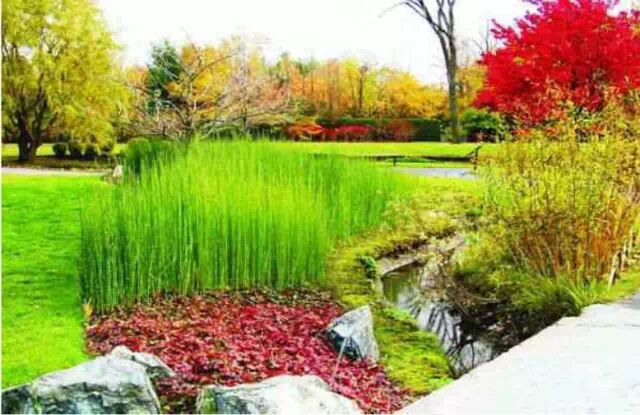 园林绿化中,水景常构成一种独特的、耐人寻味的意境。水生植物、湿生植物是园林水景的重要造景素材,园林中的各类水体都离不开植物的搭配,都是借助植物来丰富景观。观赏草颇具野趣,十分适合自然种植的形式,可应用于池塘、溪流、或大面积的水体及其驳岸的绿化,如芒、蒲苇等,与其它植物巧妙配置,可以营造出诗情画意的植物景观。很多水生及喜湿的种类还可以直接栽植在浅水中,如水葱、灯心草、香蒲等,应用于园林中不仅生动自然,还可以起到净化水体的作用,形成优美的水生植物景观。还有一部分观赏草,具有优良的抗性,可水陆两生,非常适宜营造从浮水到挺水再到陆地的过渡带。